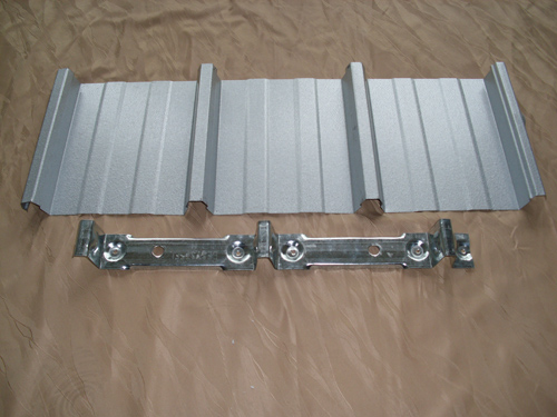 YX41-250-750屋面系统专用固定件可以让热胀冷缩时让屋面板沿着屋面斜度方向缓慢滑动,具有补偿功能,在缓慢的滑动过程中与固定支座紧密相扣,不会影响屋面与结构的结合问题。